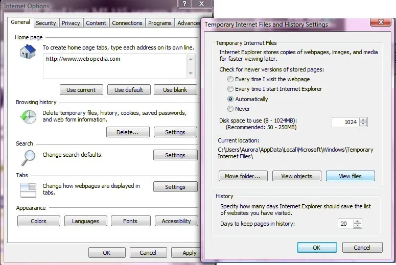 If using Internet Explorer, for example you select Tools then choose Internet Options. On the general tab you will see a section titled Browser History. Click Settings then choose View Files.